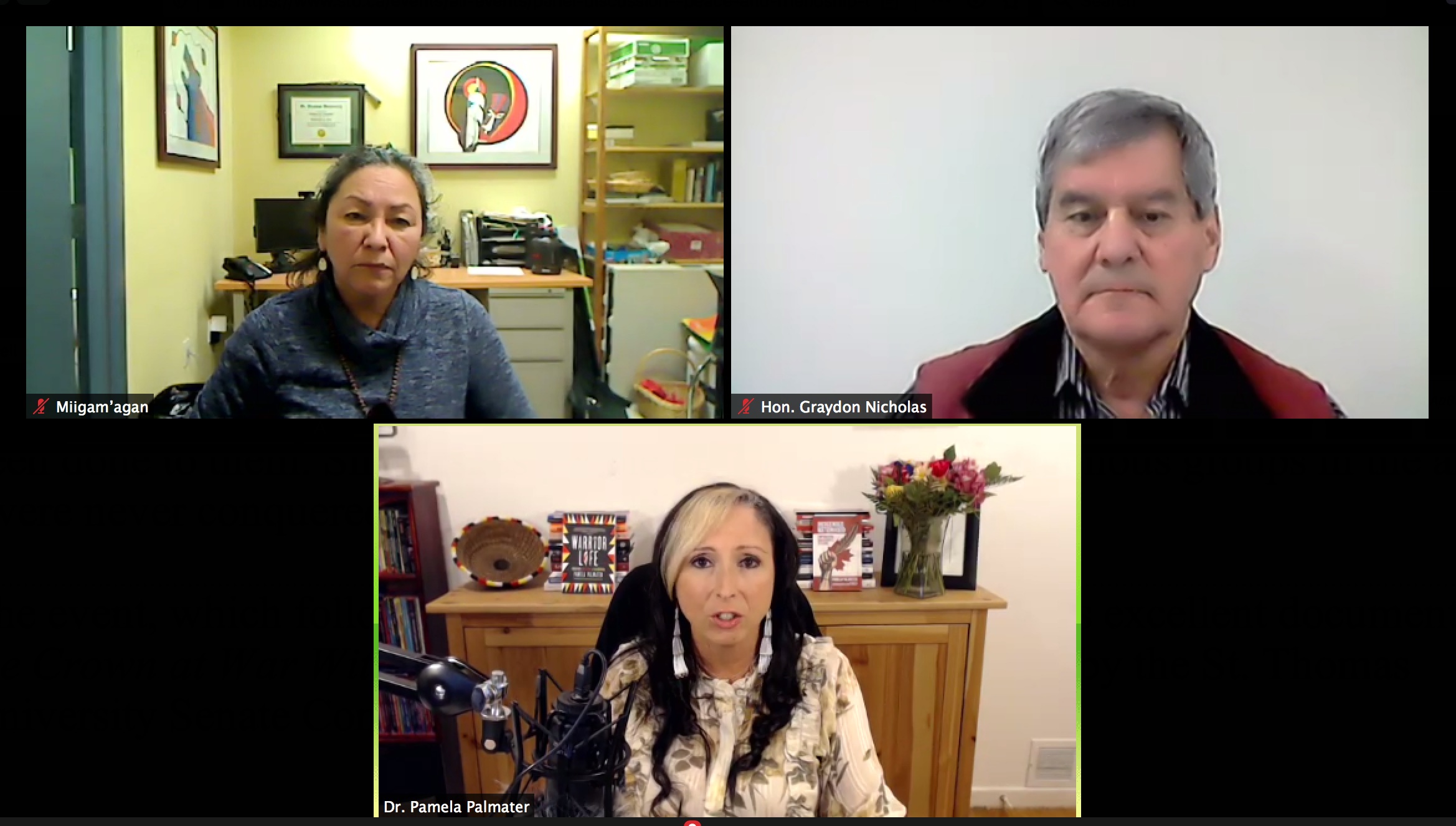 Graydon Nicholas, Elder Miigam’agan and Pamela Palmater shared their views on the online panel organized by St. Thomas University, “Peace and Friendship Treaties, Marshall Decision, [and] Self-regulated Fishery,” on Nov. 18.