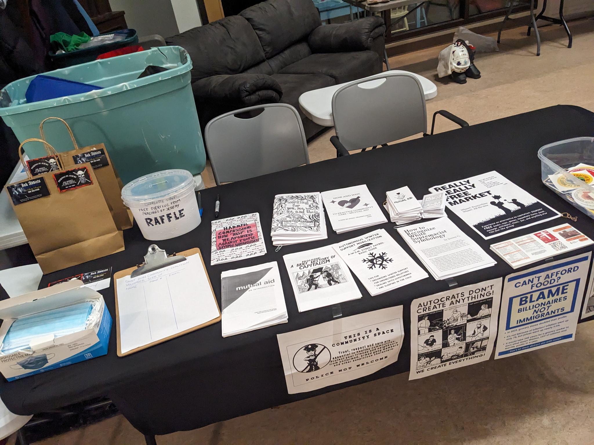 Along with food and clothing, lots of different educational material was provided. “A key component of mutual aid is education, which is why we have lots of literature and zines that are free for the taking,” said participant Brandon Flynn. “It’s important that we understand the root causes of our shared struggles so we can collectively come up with solutions,” said Flynn.