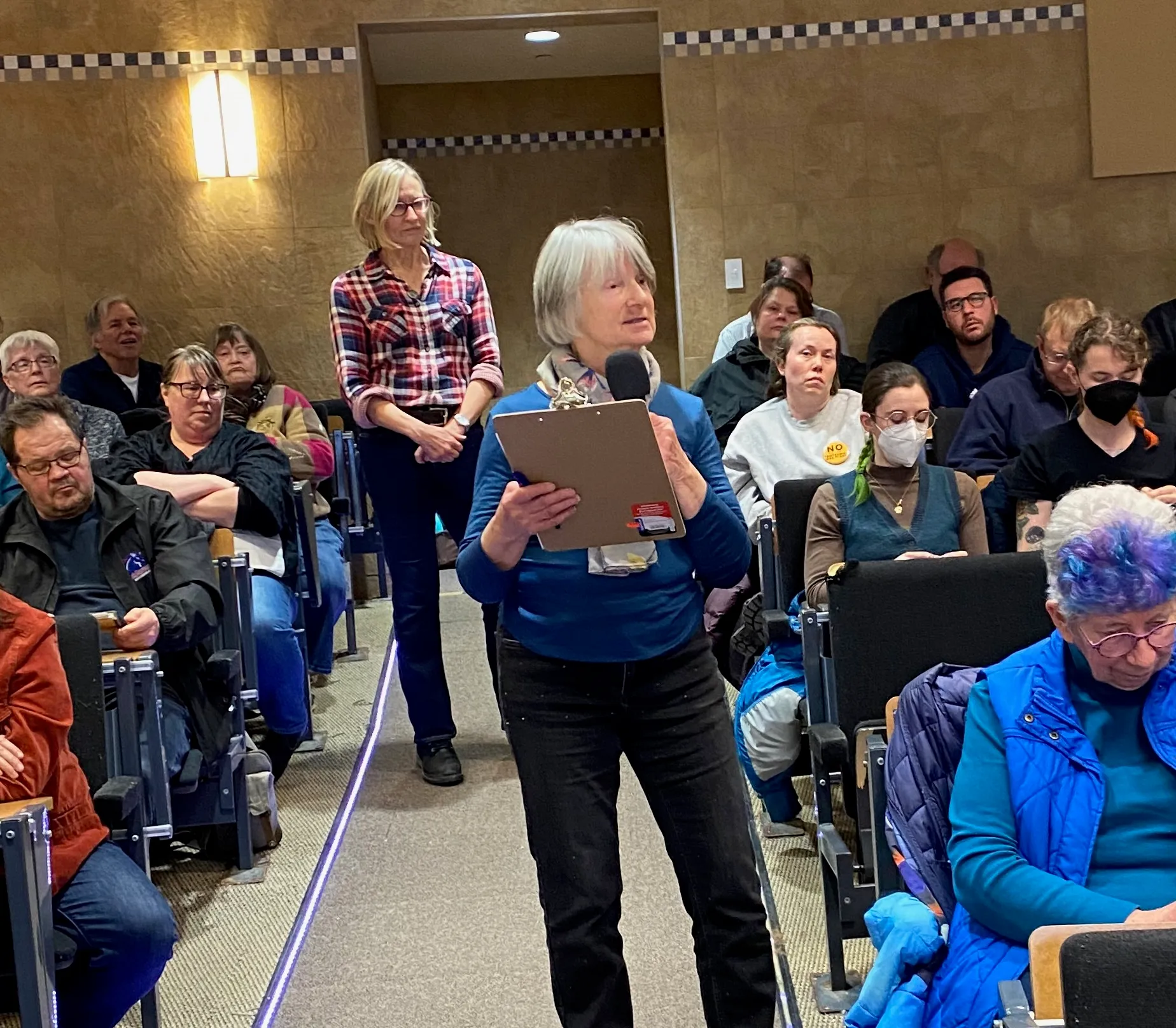 Au cours de la soirée, beaucoup de gens ont pris la parole: des résident.e.s qui habitent tout près du site, cherchant désespérément des réponses quant à l’impact sur leurs puits, des ainé.e.s défendant avec acharnement l’avenir de leurs enfants et de leurs petits-enfants, des jeunes frustré.e.s et en colère qu’on puisse contempler une nouvelle centrale à gaz en 2026. L’ainée Jean Nye de la Première nation d’Amlamgog a parlé de notre relation brisée avec le monde naturel, du devoir de planifier avec les sept prochaines générations en tête, et des jeunes qui méritent des réponses et de l’espoir. Son discours lui a valu une ovation, la seule de la soirée. Notre députée à l’assemblée législative, Megan Mitton, a aussi pris la parole, répétant fermement ce que les gens disaient à Énergie NB toute la soirée: « vous n’avez pas d’acceptation sociale pour construire ce projet ici ».