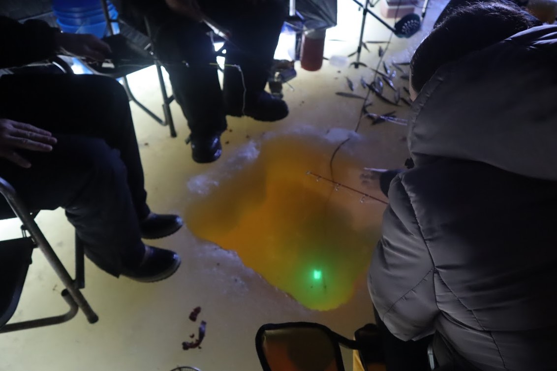 Behind Peterpaul sat a small space heater, keeping the tent warm. Inside the fishing hole in front of him, a green light floated in the water. He explained that the green light is meant to attract fish.