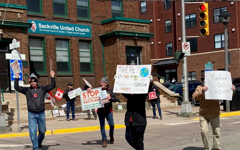 “Hey, hey USA take your plant and go away,” about 40 demonstrators chanted as they marched across Sackville’s main intersection at Bridge and Main on Wednesday.
