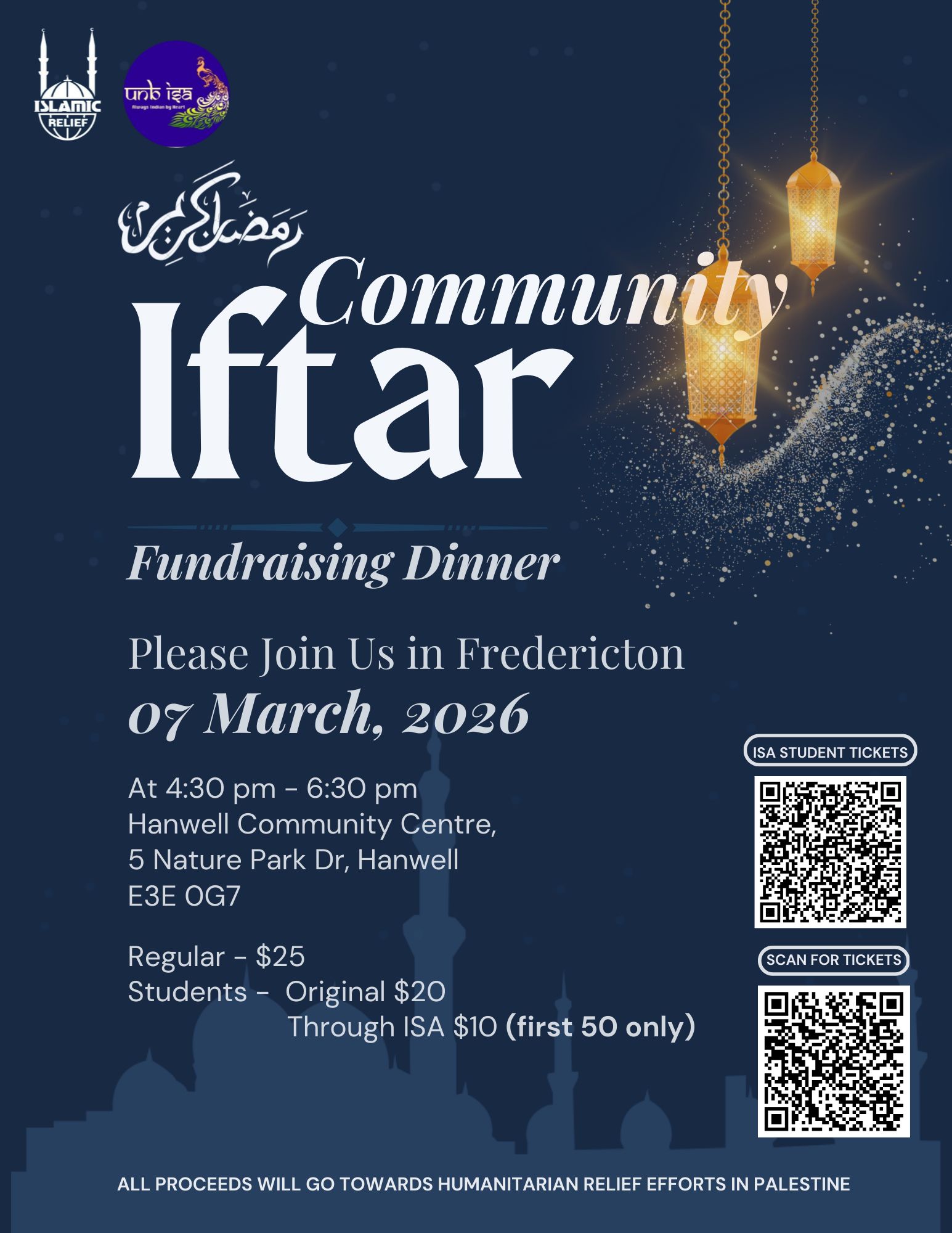 The Islamic Relief Canada Fredericton is hosting a Grand Iftar fundraiser in support of people in Gaza. The evening will feature a speaker addressing the ongoing conflict, connecting to Ramadan as attendees gather to break their fast at sunset.